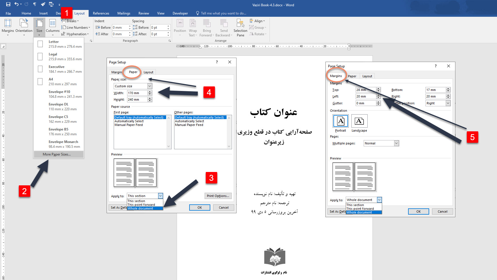 روش دستی: مطابق با تصویر بالا، با کلیک بر روی گزینه Size، در انتهای منوی باز شده، More Paper Sizes را انتخاب کرده، سپس در پنجره Page setup به شکل دستی مقادیر مورد نظر خود را در بخش Paper size وارد نمایید.