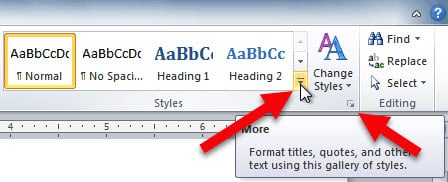 - در بخش Styleها در تب Home، ماوس خود را بر روی استایلهای مختلف لحظهای نگه دارید تا پیشنمایش استایلهای مختلف را ببینید. با کلیک بر روی فلش رو به پایین می توانید استایل های بیشتری را ملاحظه بفرمایید.